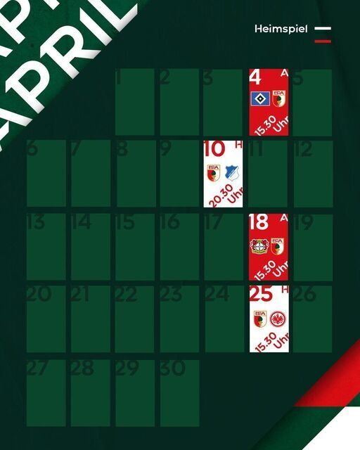 FC Augsburg @fcaugsburg 41m Das steht im 𝐀𝐩𝐫𝐢𝐥 für uns an! ❤💚🤍 👉 Unterstützt unsere Jungs im Stadion: http...