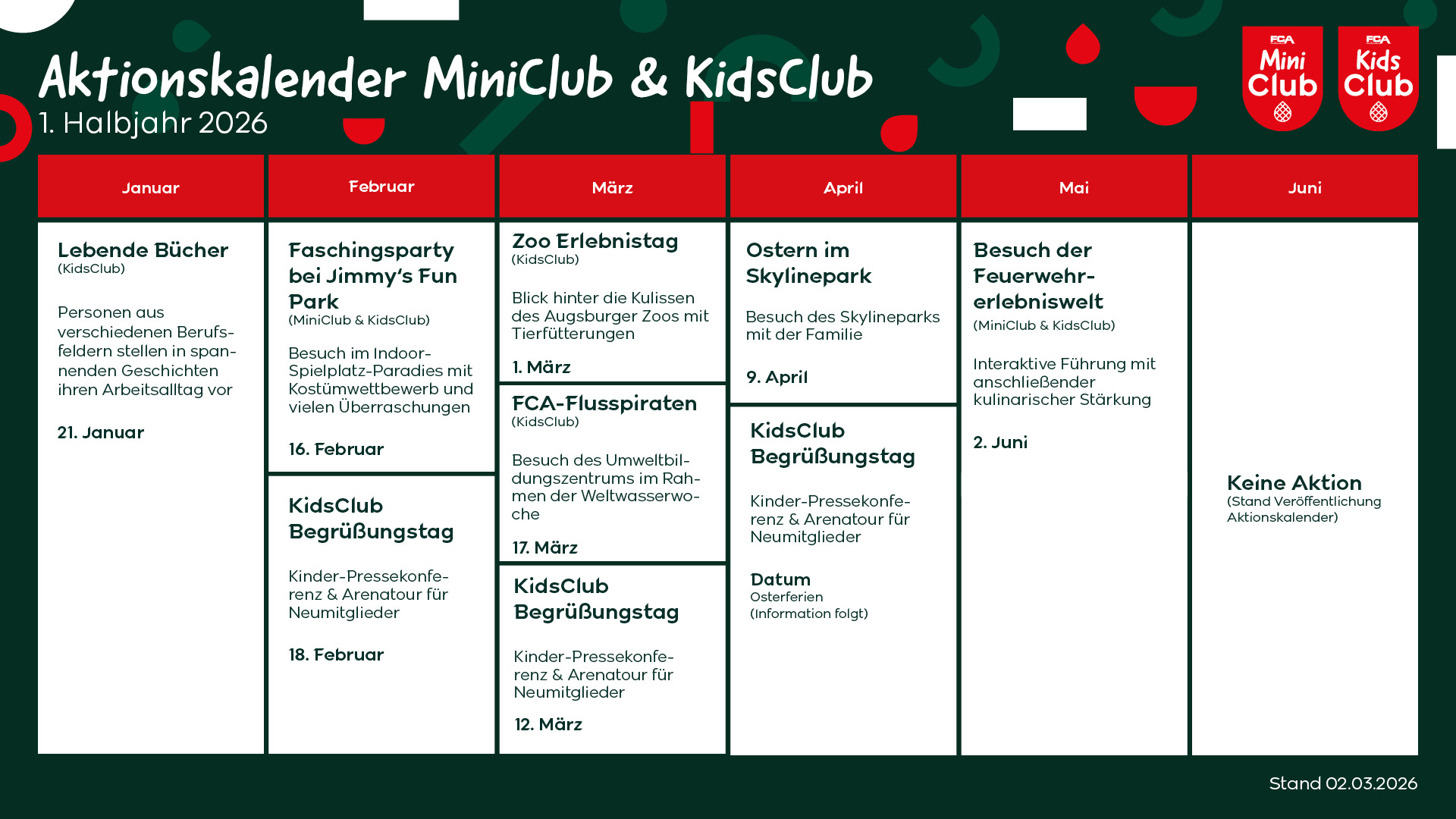Im FCA-MiniClub und -KidsClub werden die Kleinsten zu den Größten. Hier findest Du alle Infos zu unseren Mitglieder-Clubs. Zu aktuellen Veranstaltungen kannst du dich über den Online-Shop anmelden.